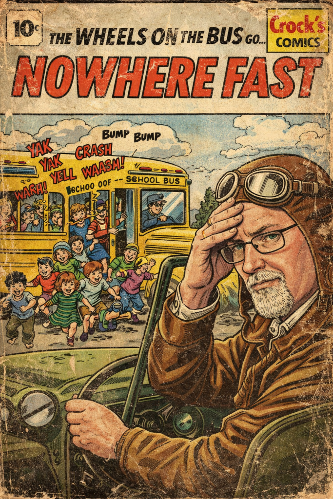 You know the song, right? 🎶 ”The wheels on the bus go round and round.”🎶 Well, I’m here to report that the song is a total fabrication. Those wheels were as stationary as a boulder in a Zen garden. The wheels on the bus went absolutely nowhere! And as the driver behind this magical bus with 5,000 kids on board—yeah, I know… slight exaggeration, but it’s my story, so be quiet—it felt like my soul was slowly evaporating into oblivion.